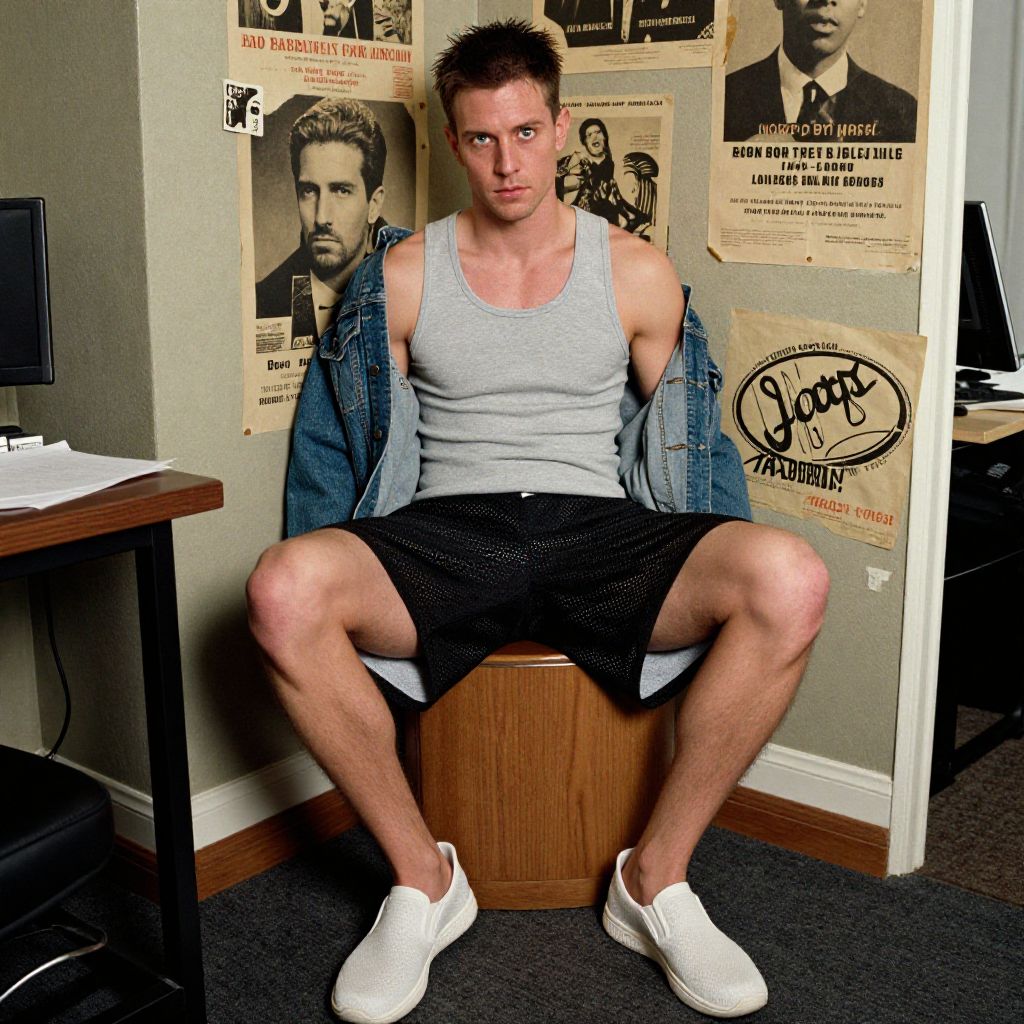 A man, light gray muscle-fit tank, black mesh shorts, minimalist slip-on athletic shoes, relaxed-fit denim jacket, cozy brainstorming nook, vintage posters, eclectic decor, chromogenic film style, thoughtful expression Man has masculine face and piercing eyes