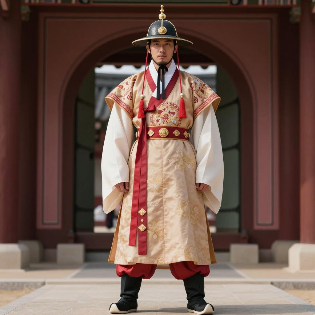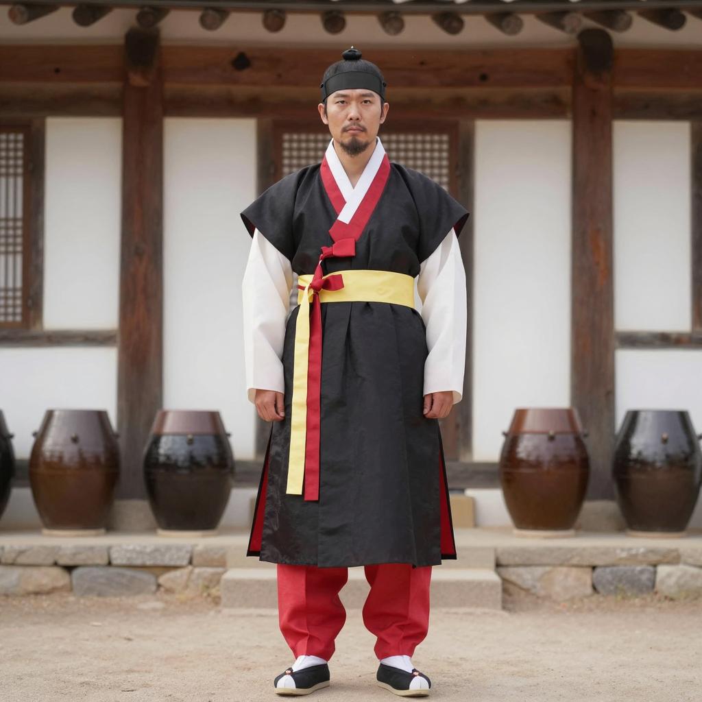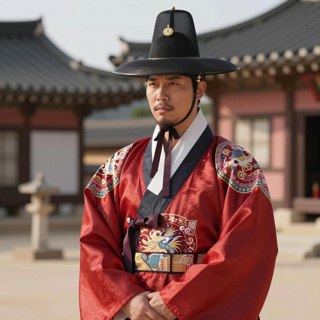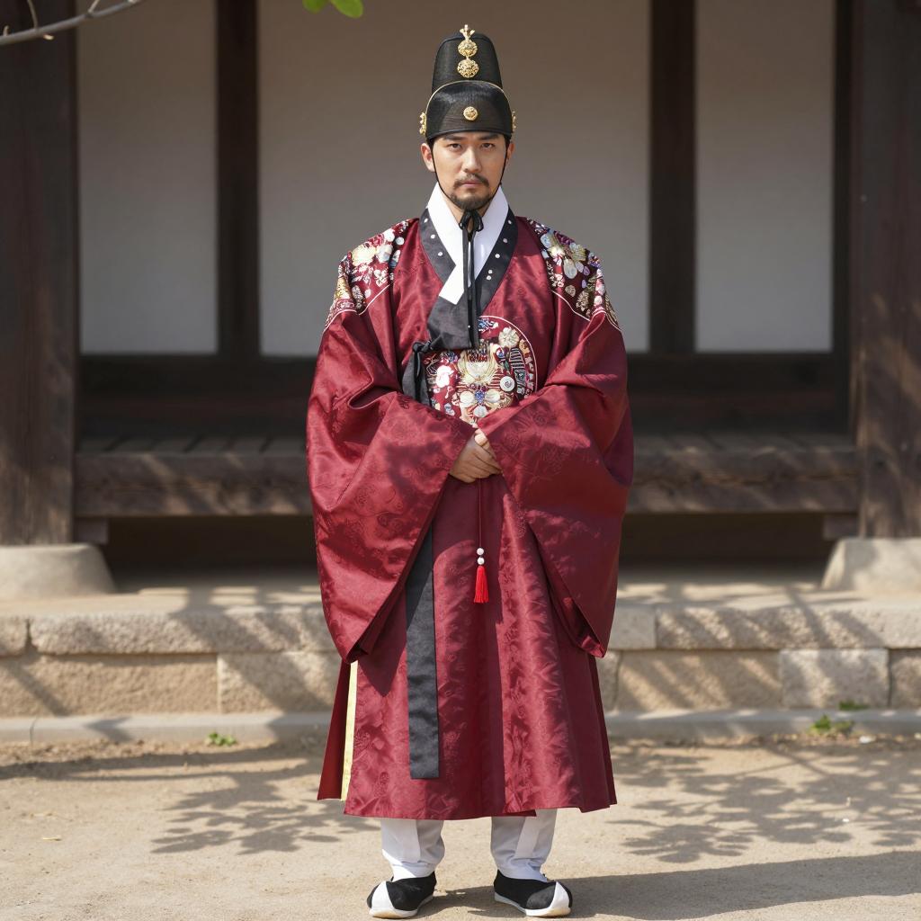 Korean outfit male costume, photo of Asian man standing in traditional Korean courtyard, wearing dark gray and red traditional Korean robe with gold floral patterns, orange belt, black leather shoes, black tall hat with gold accents, standing on stone pathway, red and white traditional Korean architecture in background, sunlight casting shadows, realistic, daytime, full-body shot, front view, calm expression, traditional attire, historical setting, cultural heritage, detailed clothing, symmetrical composition