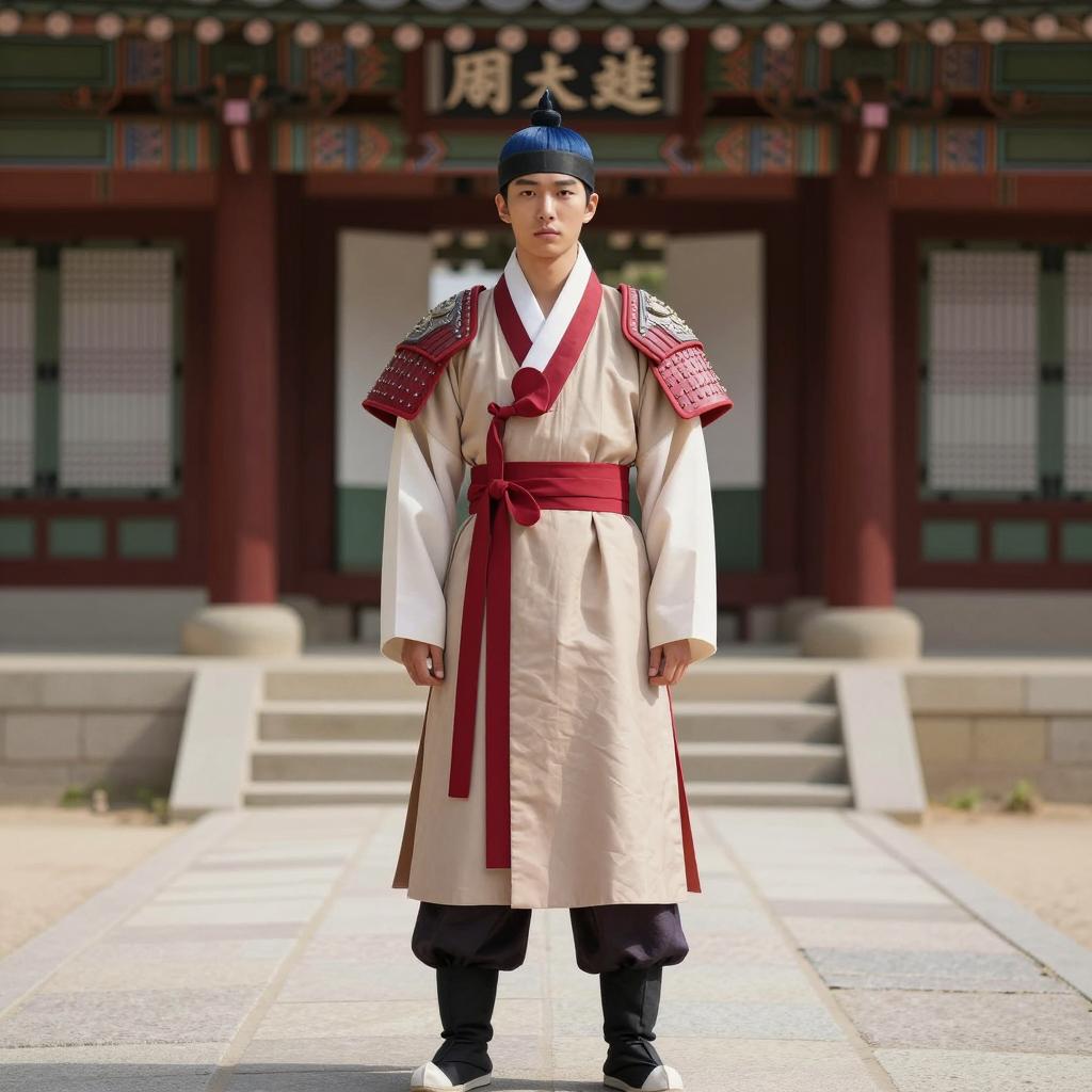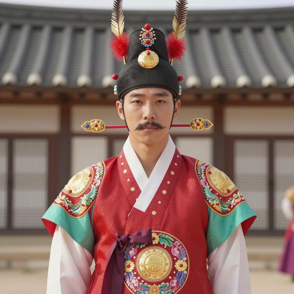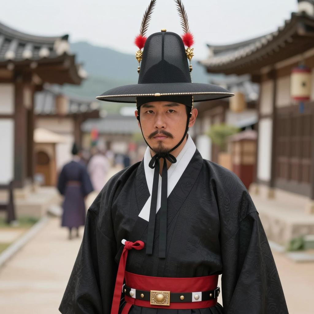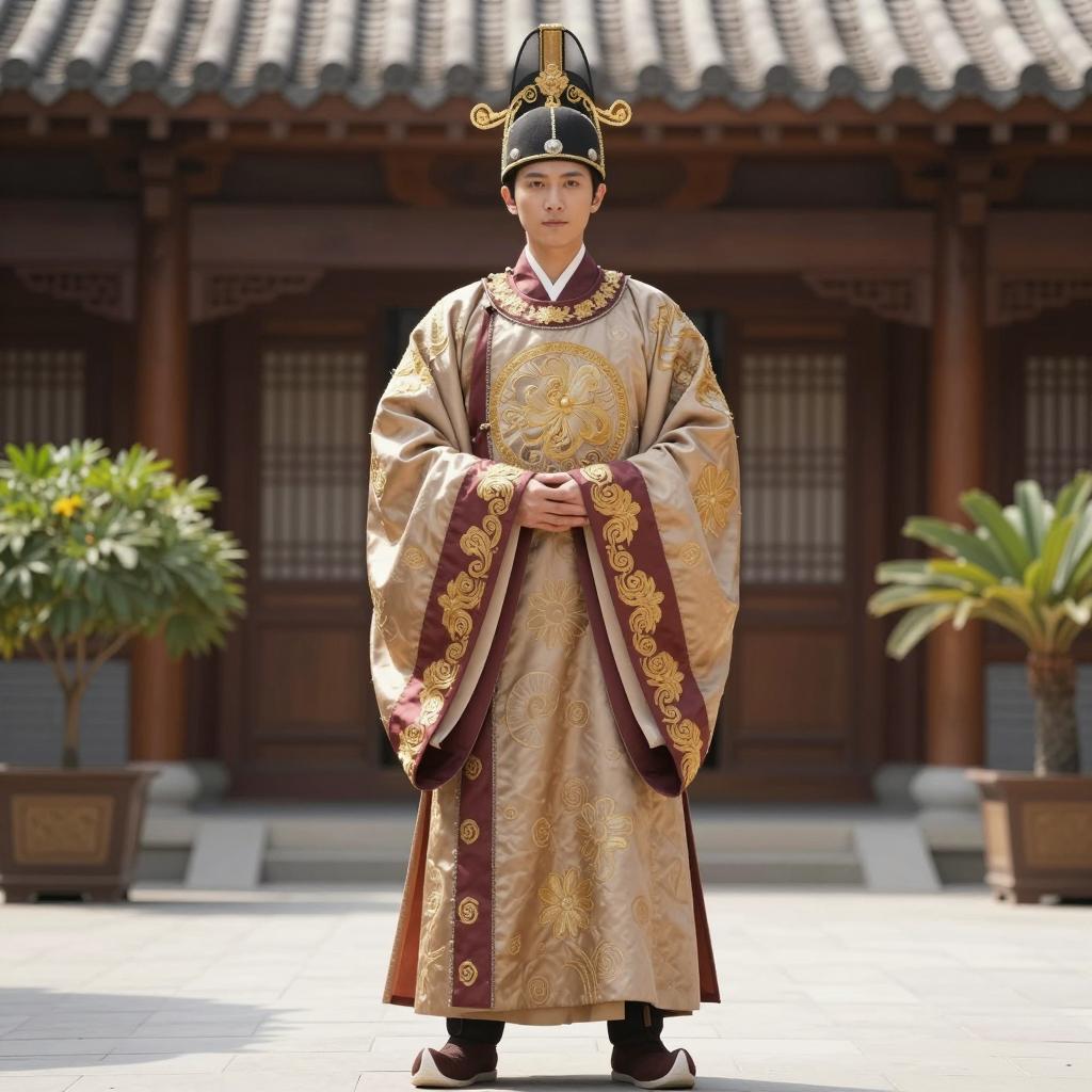 Korean outfit male costume, photo of Asian man standing in traditional Korean courtyard, wearing dark gray and red traditional Korean robe with gold floral patterns, orange belt, black leather shoes, black tall hat with gold accents, standing on stone pathway, red and white traditional Korean architecture in background, sunlight casting shadows, realistic, daytime, full-body shot, front view, calm expression, traditional attire, historical setting, cultural heritage, detailed clothing, symmetrical composition