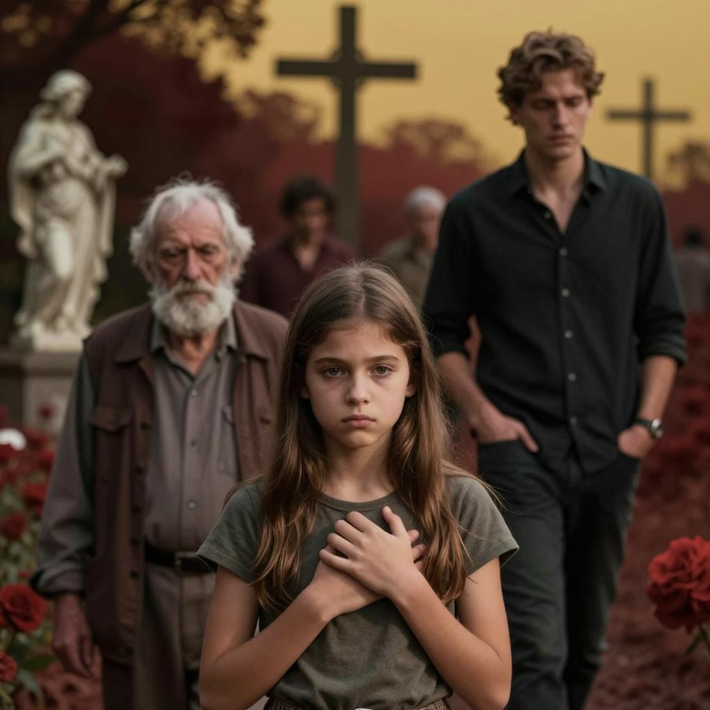 Digital collage with dark, red, and yellow tones. Foreground: young girl with long brown hair, serious expression, hands gripping her chest. Middle ground: man in black shirt, hands in pockets, walking. Background: blurred figures, old man with white beard, statues, cross. Multiple layers and ures create depth.