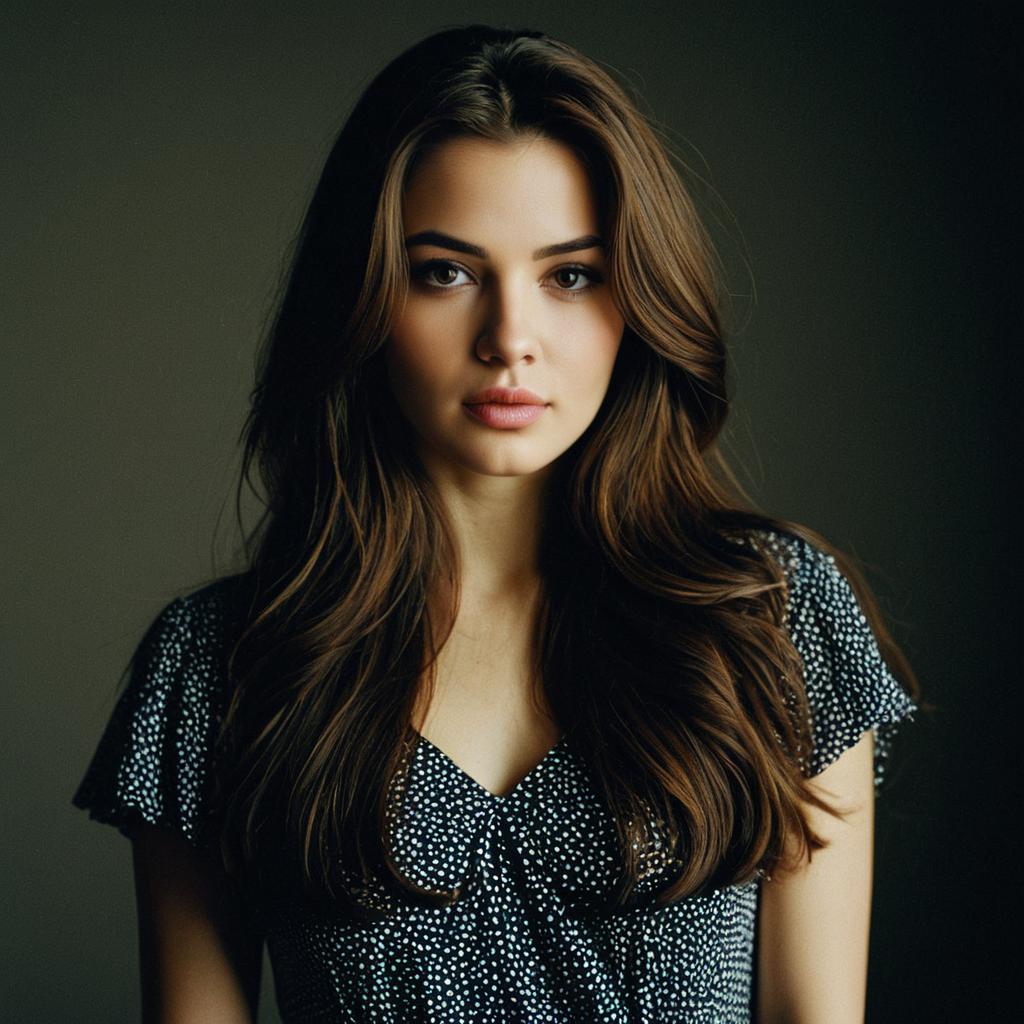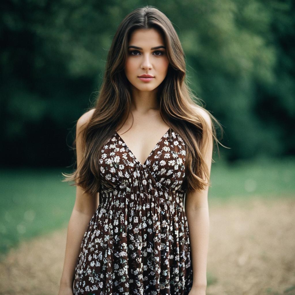 Boss lady outfit,1girl, solo, dress, brown hair, long hair, outdoors, floral print, tree, day, brown eyes, blurry, lips