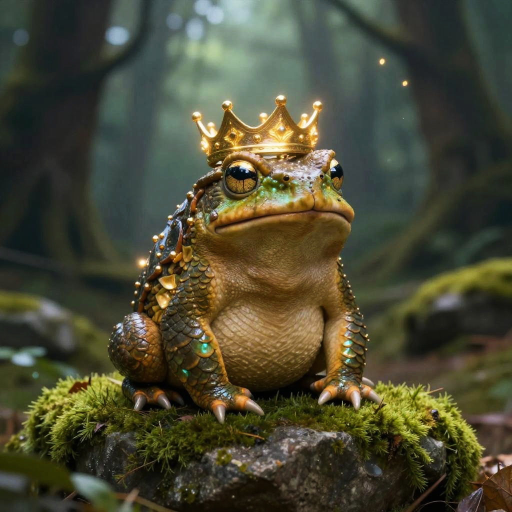 Photorealistic digital artwork of a green, scaly frog with a golden crown, sitting on a mossy rock in a mystical forest.