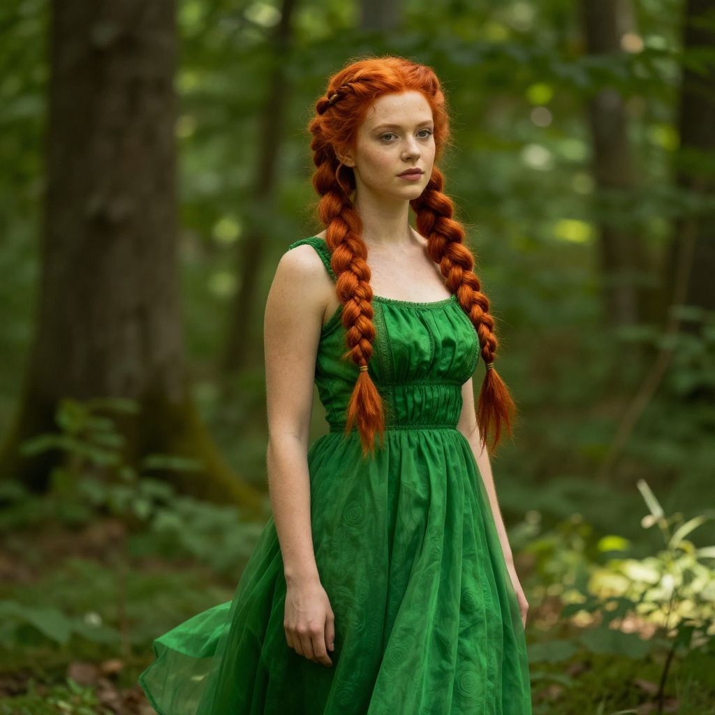Photograph of a fair-skinned woman with long, vibrant red braided hair standing in a lush, green forest. She wears a sleeveless, green, chiffon dress that flows gracefully to the ground. Her expression is calm and slightly melancholic. The background is filled with tall trees and dense foliage, creating a serene, natural setting. The lighting is soft, with sunlight filtering through the leaves, highlighting her hair and dress. Her delicate features and the intricate braids add a fairy-tale-like quality to the image.