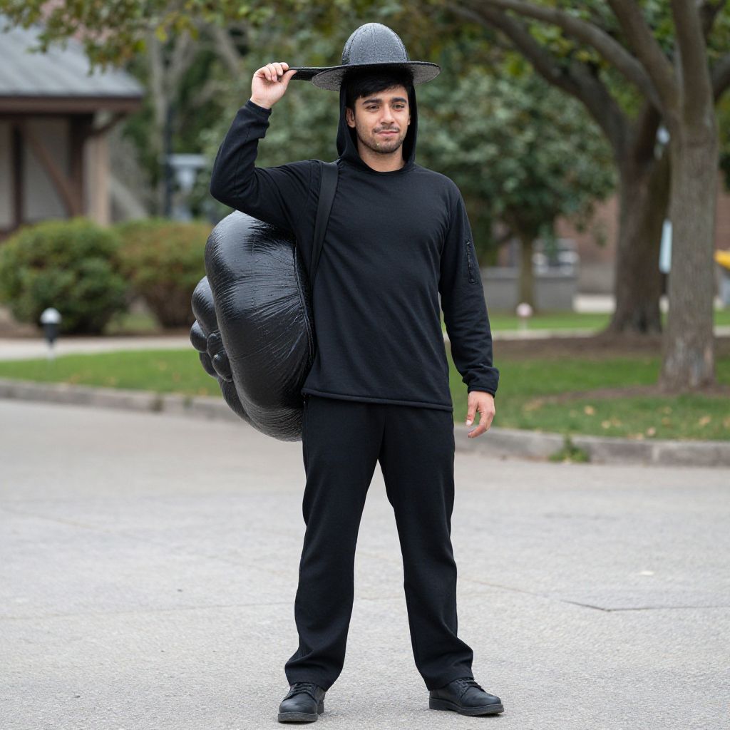 "gary snail costume adult, 1boy, male focus, solo, pants, full body, black pants, looking at viewer, black hair, standing, hood, outdoors, holding, jacket, smile, hat, short hair, realistic, shoes, facial hair Realistic photo of casual sexy person with pretty face"