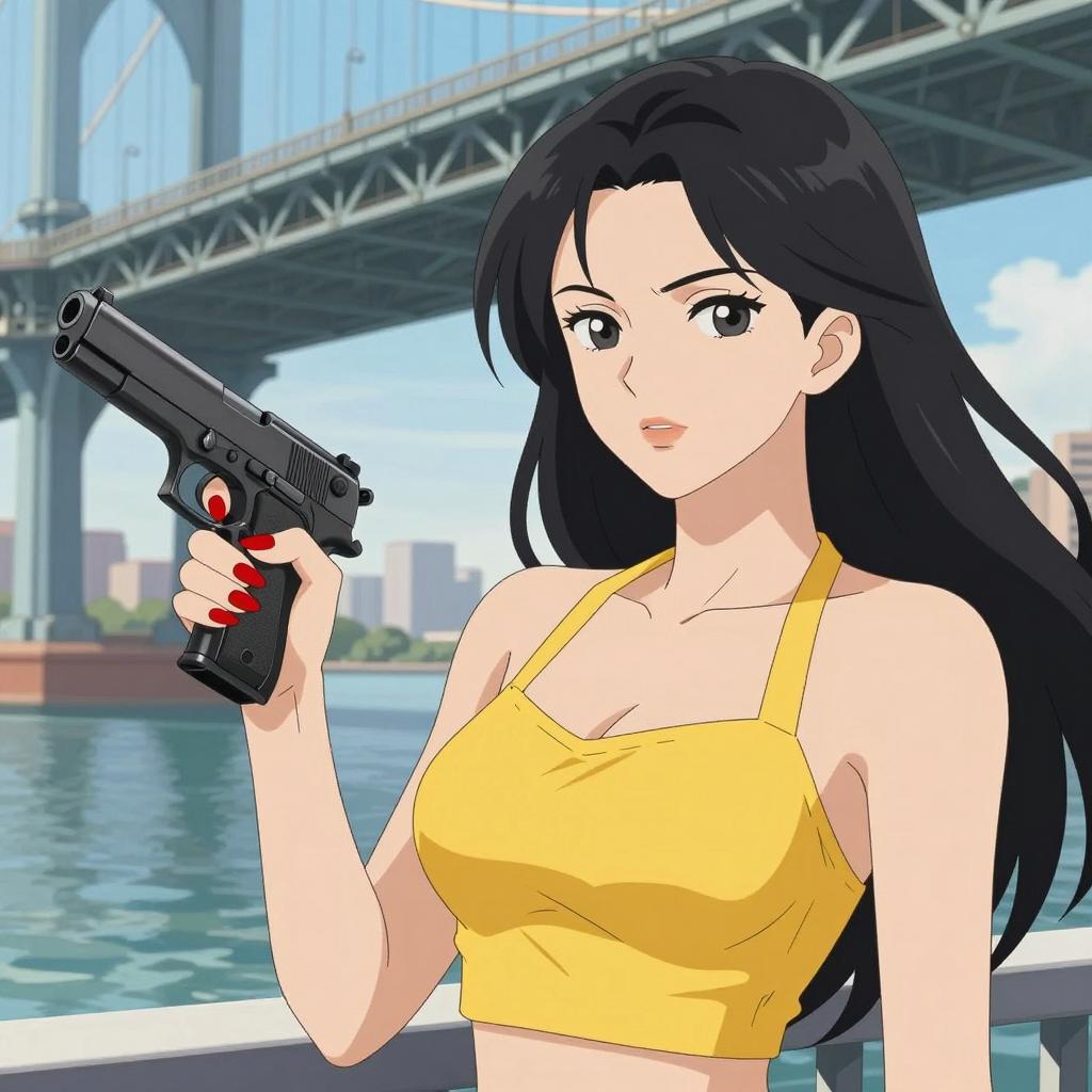 Illustration of a woman with long black hair, wearing a yellow halter top, holding a black handgun with her right hand. Her nails are painted red. She stands under a bridge with blue sky and water in the background. Her expression is confident. The bridge structure is metallic with ornate supports. The background includes a distant cityscape. The woman is in the foreground, occupying the right side of the image.