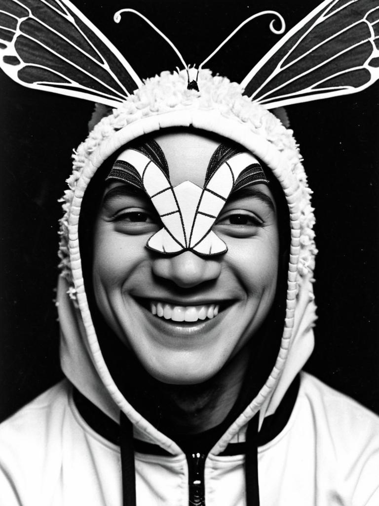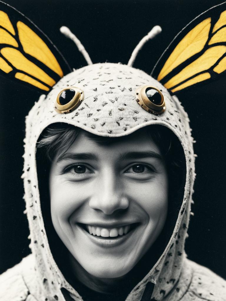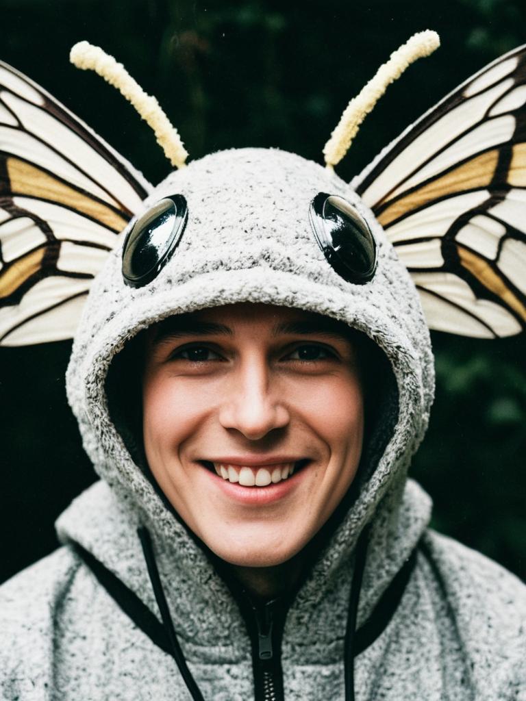 Boy in Moth Costume, close-up cheerful headshot with antennae