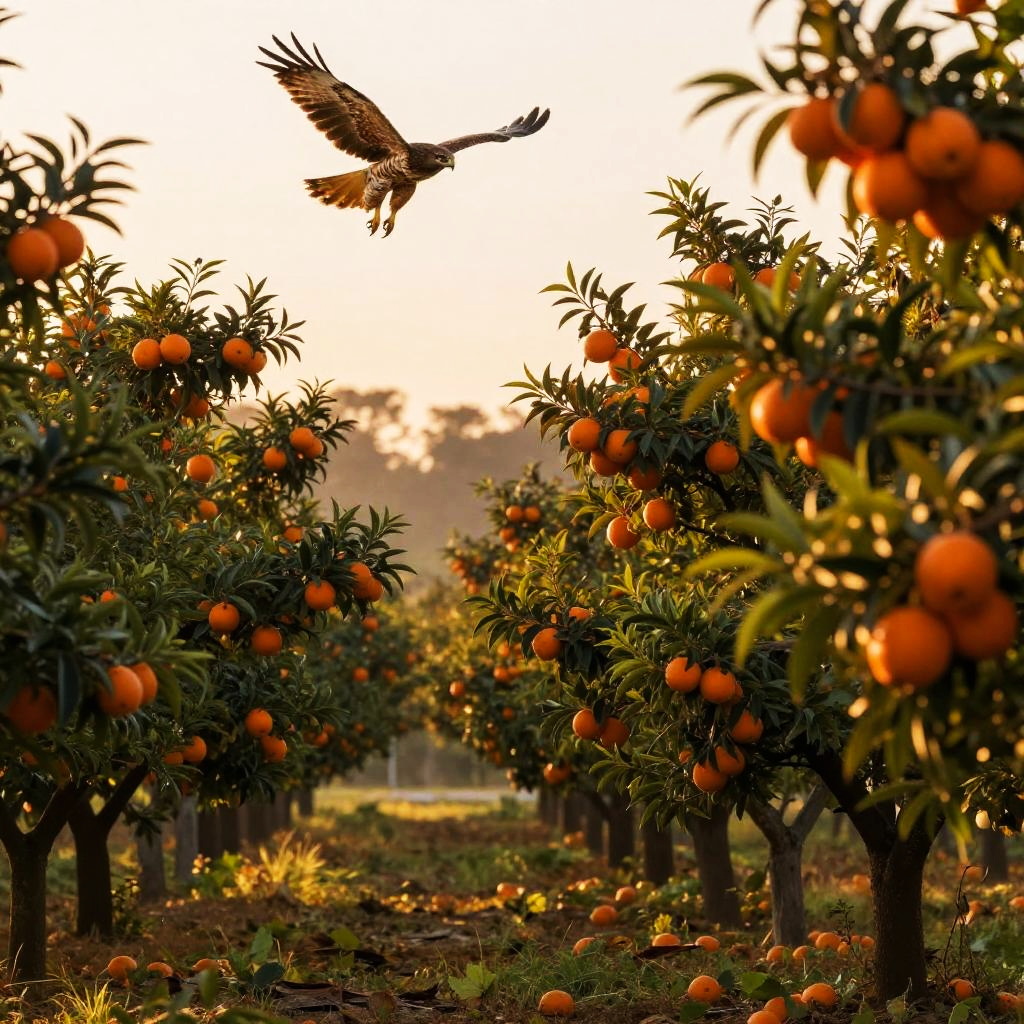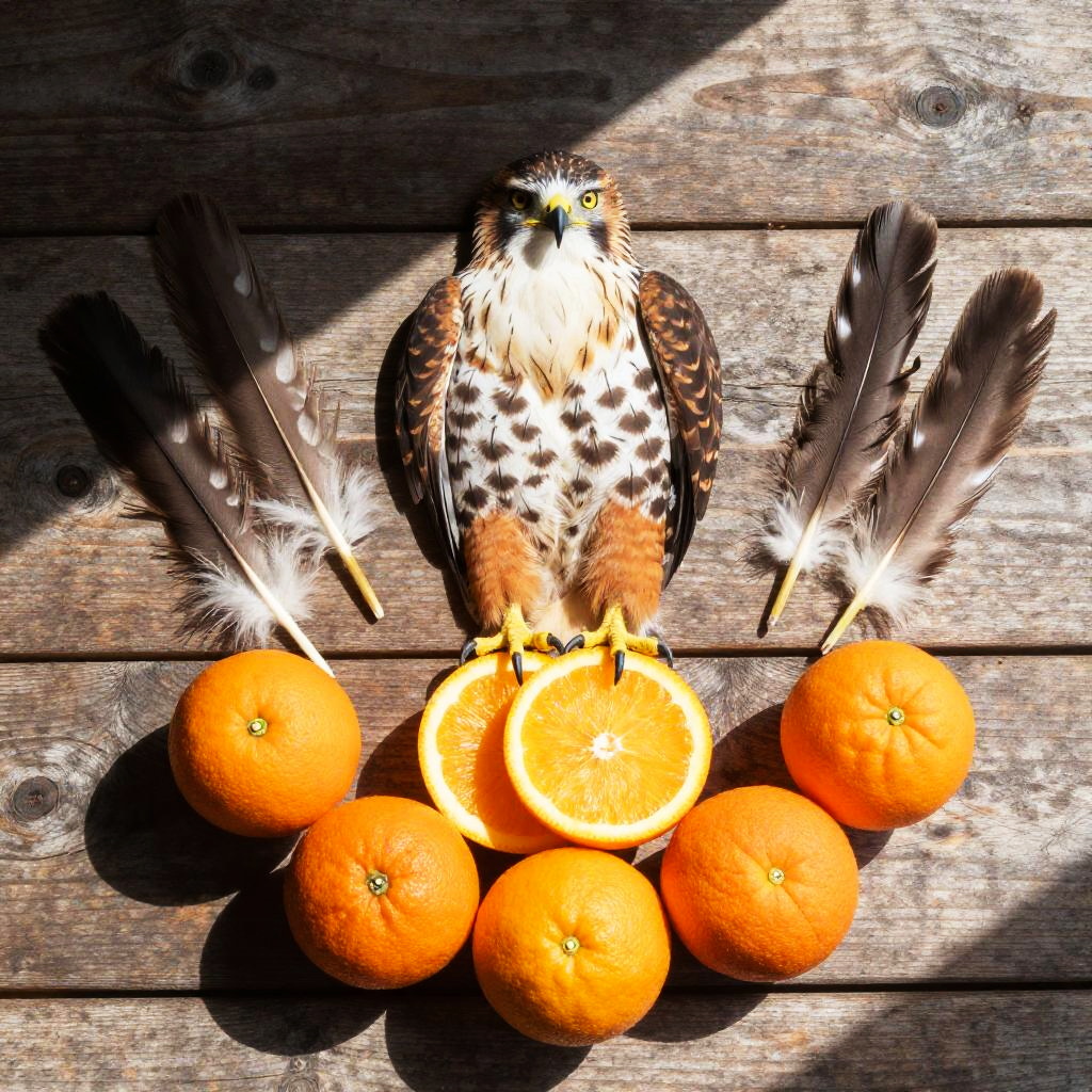 Hawk hawk fruit bowl set on a rustic wooden table, bright sunlight casting natural shadows, vivid colors of orange fruits contrasted with hawk feathers arranged artistically around
