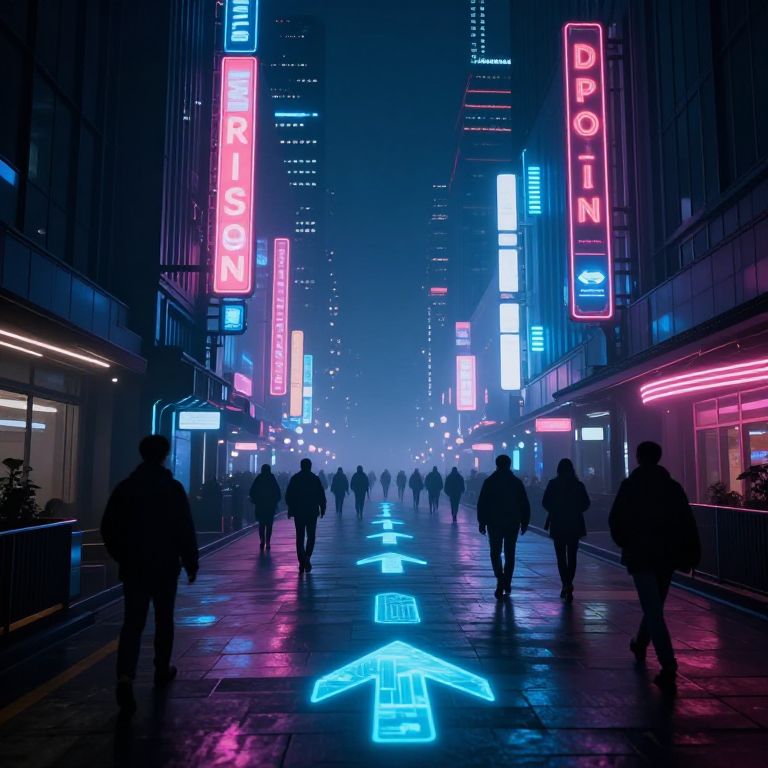 Wayfinding in a futuristic urban environment, glowing neon signs and holographic arrows guiding pedestrians through a bustling cityscape at night, cyberpunk aesthetic, vibrant colors, misty atmosphere, detailed architecture