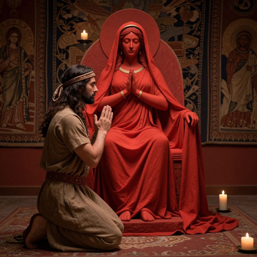 In this evocative image, a man kneels before a red goddess, his hands pressed together in a gesture of reverence. The man is adorned with a headband and a beard, his long hair cascading down his back. He is dressed in a simple, earth-toned robe, which contrasts with the vibrant red of the goddess's attire. The goddess, seated on a throne, is draped in a flowing red robe that extends to the floor, her hands pressed together in a gesture of prayer. The room is dimly lit by several candles, casting a warm, flickering light that enhances the mystical atmosphere. The walls are adorned with tapestries and religious symbols, adding to the sacred ambiance. The overall composition is balanced, with the man and the goddess positioned centrally, their figures aligned in a harmonious manner. The interplay of colors, textures, and shapes creates a rich, immersive visual experience, evoking a sense of reverence and devotion.