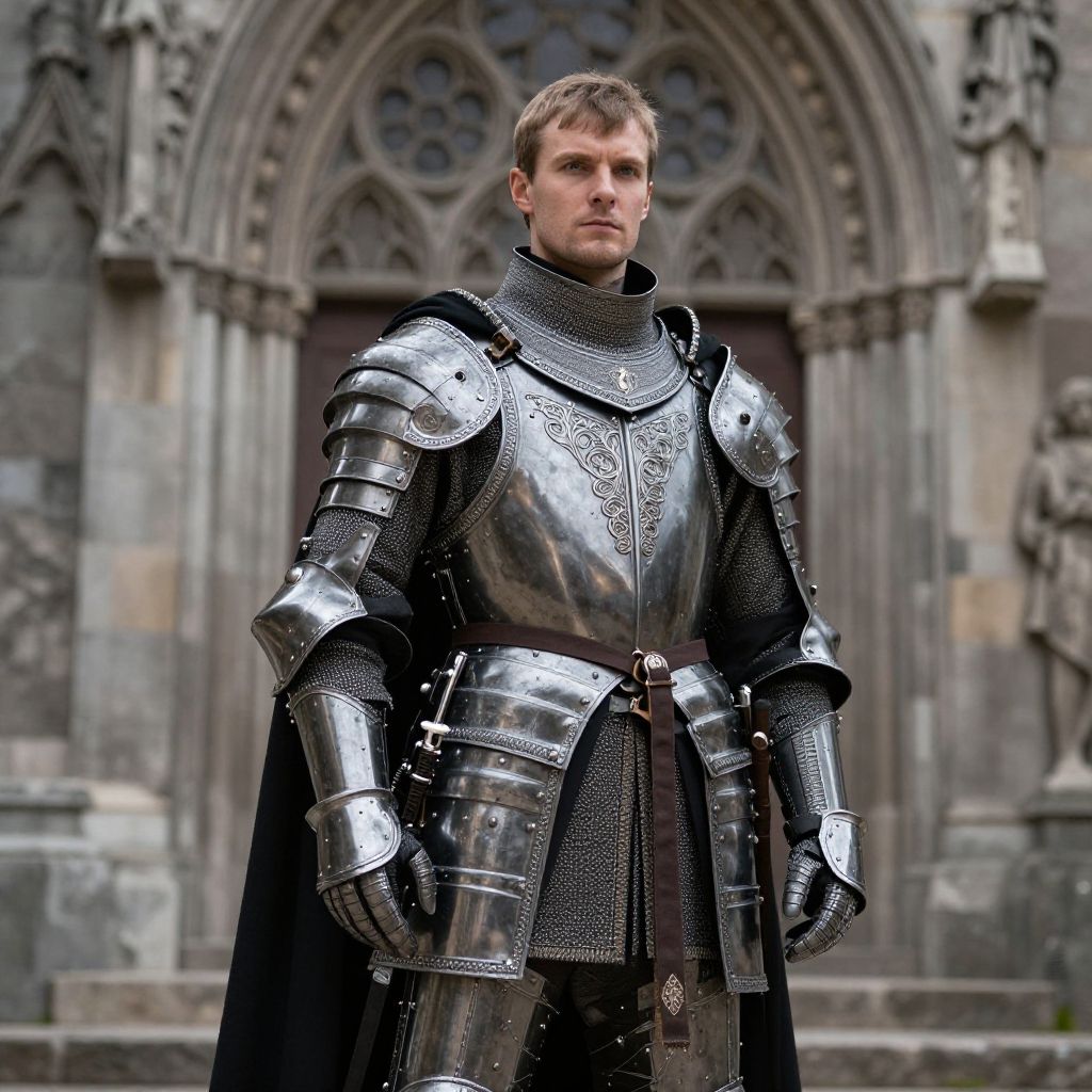 This striking image showcases a man dressed in an intricately designed medieval armor, featuring ornate silver detailing and a flowing black cape. The setting, with gothic architecture in the background, enhances the impressive and regal appearance of the armor, evoking a sense of chivalry and historical grandeur.