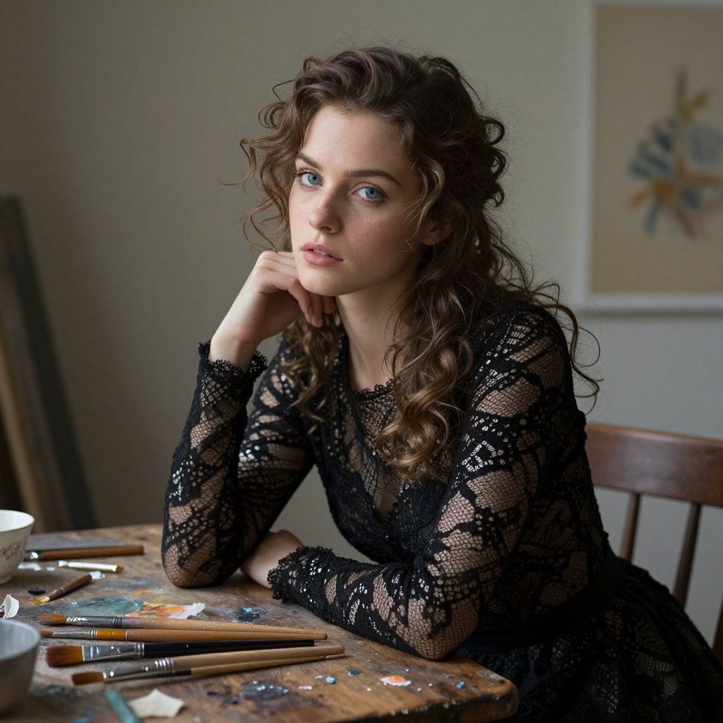 Craft a hyperrealistic portrait of an enigmatic artist with chiseled features and tender blue eyes donning an elegant black lace dress amidst scattered paintbrushes and palette remnants on a rustic wooden table. Capture her intense gaze and pensive expression as she gazes introspectively towards a faintly visible canvas on the wall, seamlessly blending surrealism with meticulous attention to detail in the reflections of light dancing across her artfully tousled hair and intricate dress from an unusual perspective.