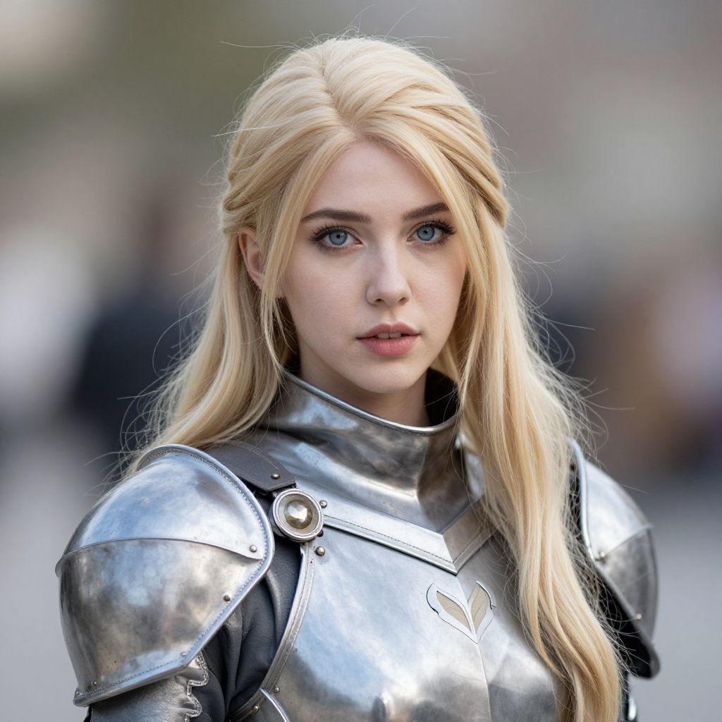 Heather costume, 1girl, solo, blue eyes, blonde hair, realistic, looking at viewer, blurry, blurry background, lips, armor, long hair