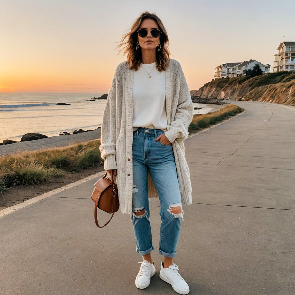 Photo of a Compact Frame woman, Long Shag outfit inspo, casual chic with an oversized beige sweater, distressed denim jeans, white sneakers, leather crossbody bag, gold hoop earrings, minimalist style, neutral tones, cozy materials, Slate Gray, Cotton, straight leg, sneakers, beach sunset, vibrant and sunny