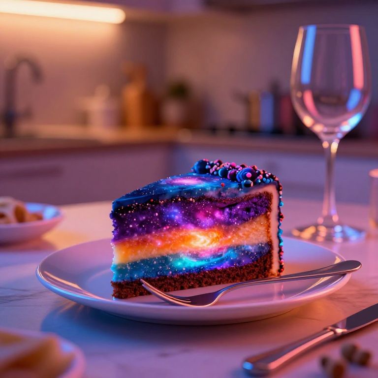 The image presents a delectable slice of galaxy cake, its layers illuminated with vibrant neon lights, creating a mesmerizing visual effect. The cake, with its multicolored layers of blue, purple, and orange, sits on a white plate, accompanied by a fork and knife. The plate is placed on a dining table, with a wine glass positioned to the right, reflecting the ambient light. The background is softly blurred, featuring warm, romantic lighting that enhances the cozy atmosphere of the kitchen. The scene is captured with a medium shot, showcasing the cake's intricate details and the interplay of light and shadow. The overall composition is balanced, with the cake as the central focus, surrounded by the soft glow of the environment. The use of gel lighting and volumetric light adds depth and dimension, while the neon lights and chromatic aberration create a futuristic, cinematic ambiance. The image is hyper-realistic, with photorealistic textures and ray-tracing reflections that make the scene appear almost tangible. The 4k resolution ensures that every detail is captured with precision, from the delicate sprinkles on the cake to the subtle reflections on the glass.