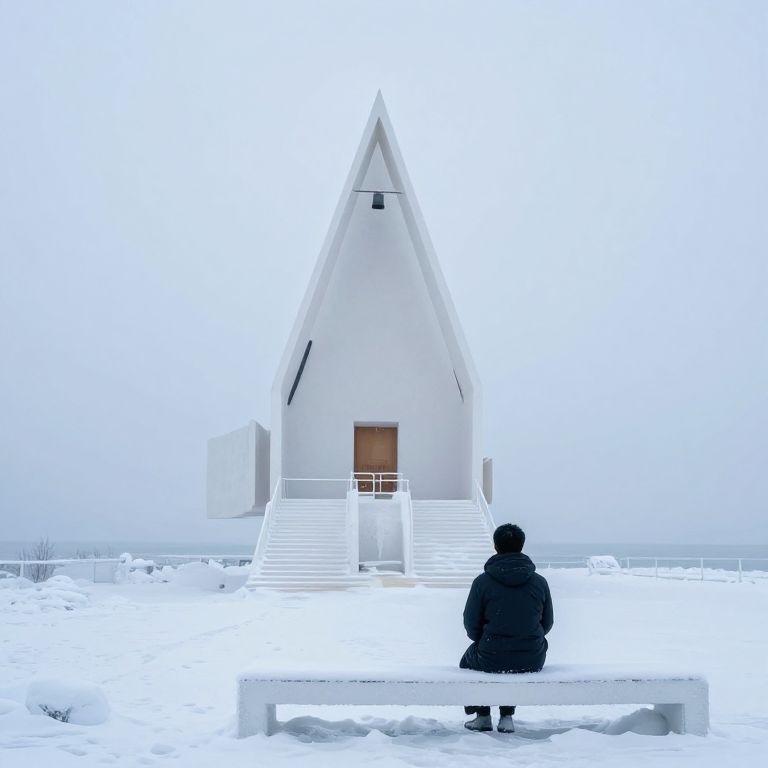 Photograph of a minimalist, white, triangular-roofed chapel in a snowy landscape. A person, dressed in a black coat and hat, sits on a white bench in the foreground, facing the chapel. The building has a small, square wooden door and white steps leading to a small porch. The sky is overcast, blending into the snowy ground, creating a monochromatic, serene winter scene. The person's silhouette contrasts starkly against the bright white surroundings, emphasizing the cold, quiet atmosphere.