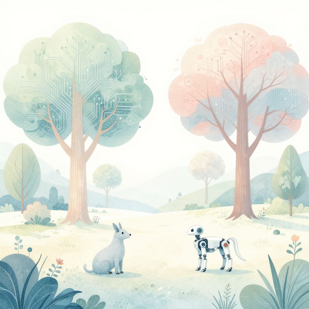 AI illustrations featuring a serene landscape where nature merges with technology: trees with circuit-board leaves, animals with robotic enhancements, soft pastel color palette, intricate linework, ethereal and imaginative atmosphere.