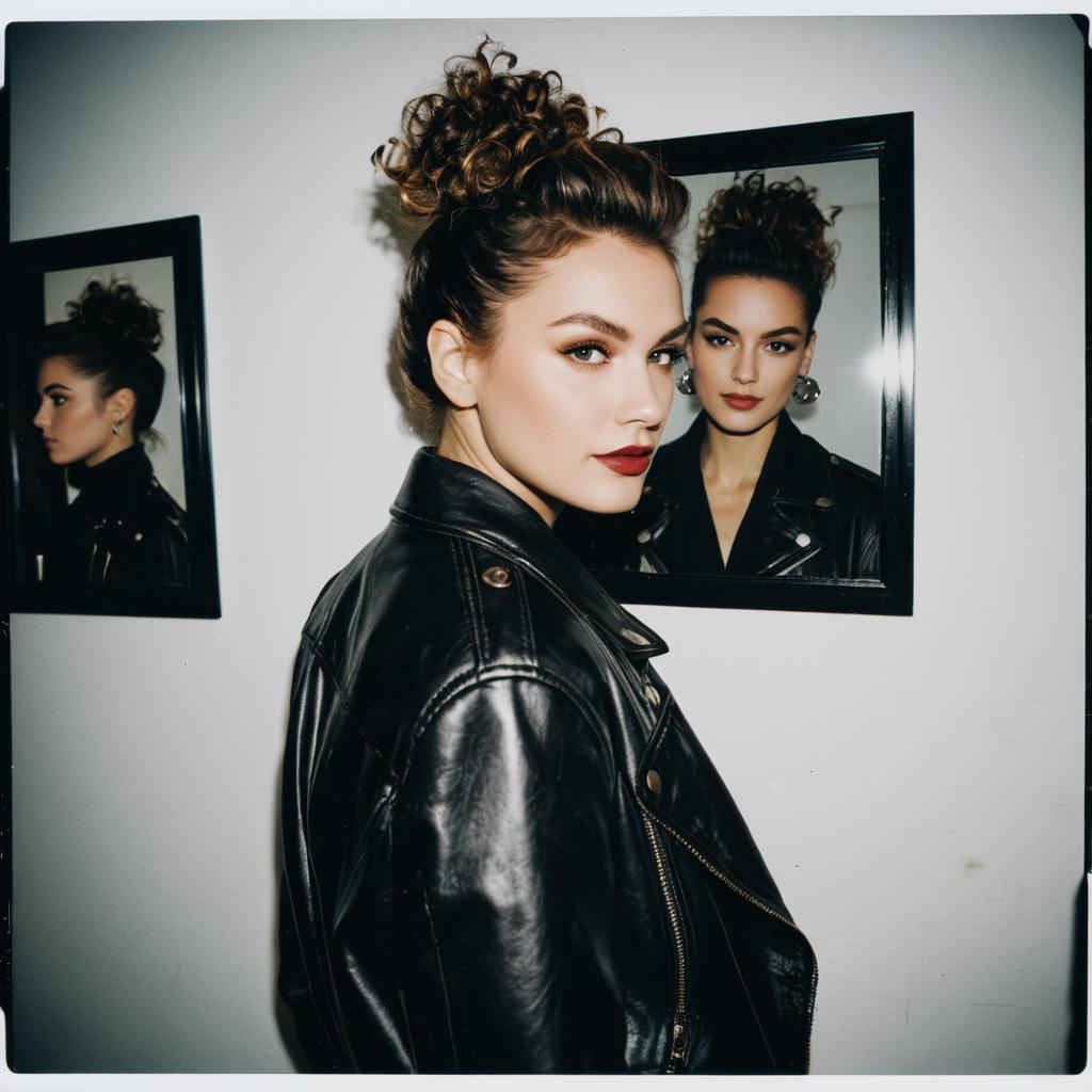 Dynamics, a printed Polaroid of a vivacious 29-year-old woman with porcelain skin and smoky eye makeup with curly messy bun hair wearing a sleek leather jacket as a model backstage at a high fashion show, hanging on a wall near a mirror, high quality, high resolution, sharp focus, cinematic, moody, cinematic film still