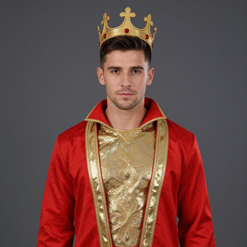 Photograph of a young Caucasian man with short, dark hair and a slight stubble, wearing a red satin robe with a gold, intricately patterned front panel. He has a serious expression and is adorned with a gold crown featuring red jewels and cross-shaped ornaments. The background is a solid, dark gray, allowing the vibrant red and gold of his attire to stand out prominently. The lighting is even, highlighting the rich textures of the fabric and the shiny gold details.