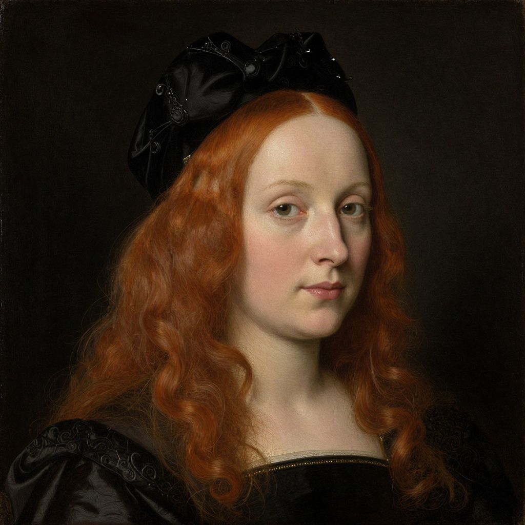 A finely detailed oil painting by Hans Memling, showcasing a portrait of a woman with vibrant red hair, adorned in a black headdress and attire, rendered with meticulous realism and dramatic lighting against a dark background.