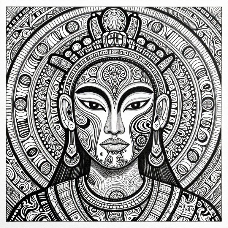 A detailed, psychedelic drawing of a figure with intricate patterns on its face and a complex, circular background.