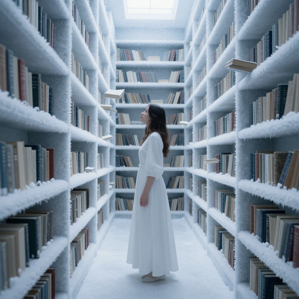 In a surreal, computer-generated library where shelves of books are encased in frosty snow, a woman in a flowing white gown stands amidst the icy aisles, her presence causing the books to shift subtly as if responding to her unspoken thoughts, creating a dreamlike, ethereal atmosphere.