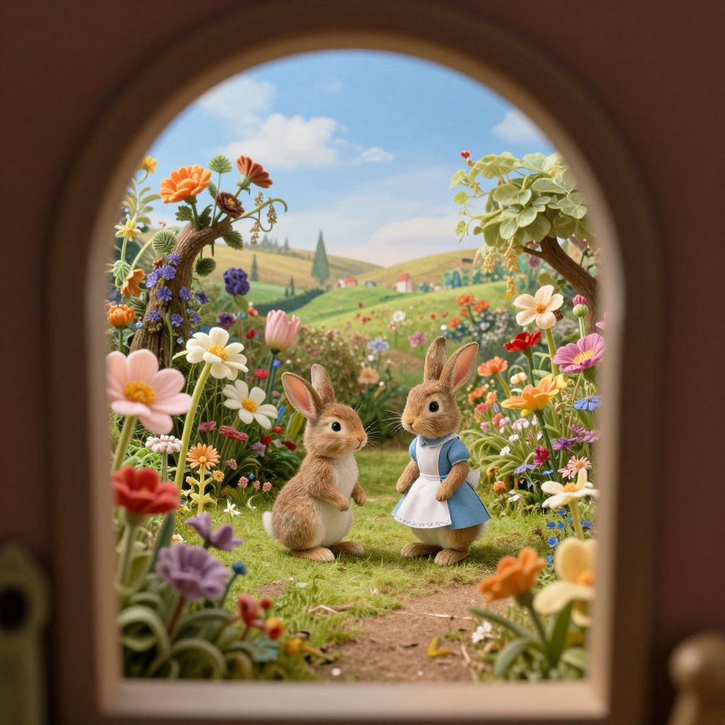 Craft an image that blends the whimsical charm of Beatrix Potter's illustrations with surreal elements reminiscent of Salvador Dali. Envision a curious rabbit named Fluffy amidst an oversized garden where flowers reach towards the sky. Capture this enchanting scene from a unique vantage point, as if seen through a miniature keyhole, revealing only tantalizing glimpses of the landscape and its inhabitants in an Alice-in-Wonderland-inspired atmosphere. This visual tale should instill feelings of childlike wonder and curiosity while hinting at deeper mysteries concealed within the garden's beauty.