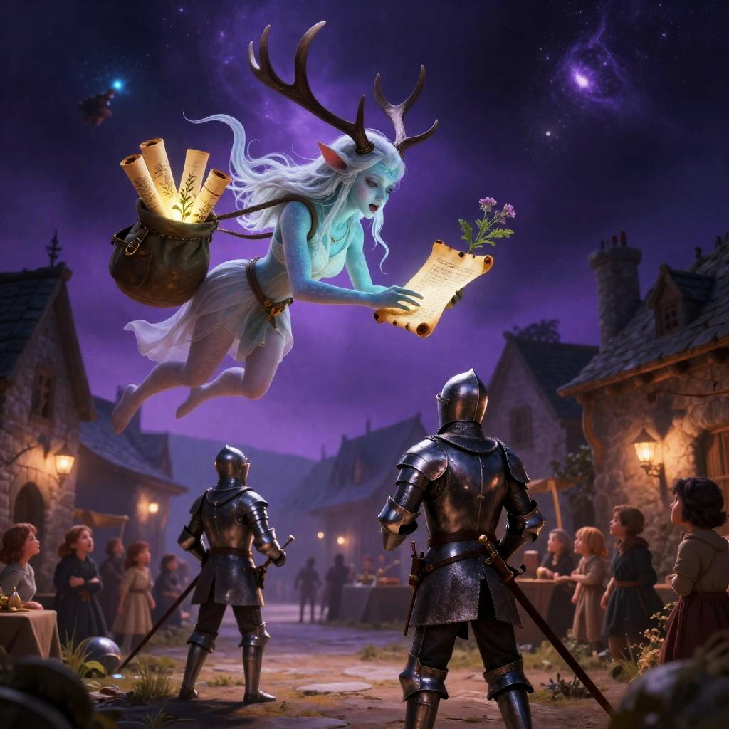 In a luminescent comet bazaar drifting through a violet nebula, an antlered xeno-herbalist with translucent skin, delicate tendrils and a floating satchel of glowing scrolls exchanges ancient scrolls for mystical herbs, her voice resonating through the chaos of the market. In a medieval village square, two knights prepare for a legendary joust, the townsfolk peering anxiously from behind stone walls, the atmosphere thick with tension.:1.2) artgerm, 4k image, sharp focus