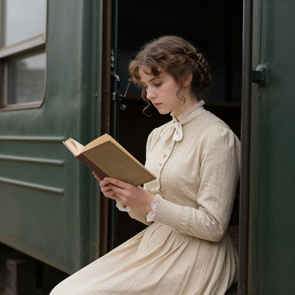 Photograph of a young woman with fair skin and dark brown hair styled in an updo, wearing a cream-colored, long-sleeved, Victorian-style dress with lace trim. She is intently reading a brown, old-fashioned book held in both hands. The background features a green, vintage train car with dark wooden windows, standing on railway tracks. The lighting is soft, creating a nostalgic, historical atmosphere. The woman's expression is focused and serene, and she is positioned slightly to the right, with the train car occupying the left half of the image.