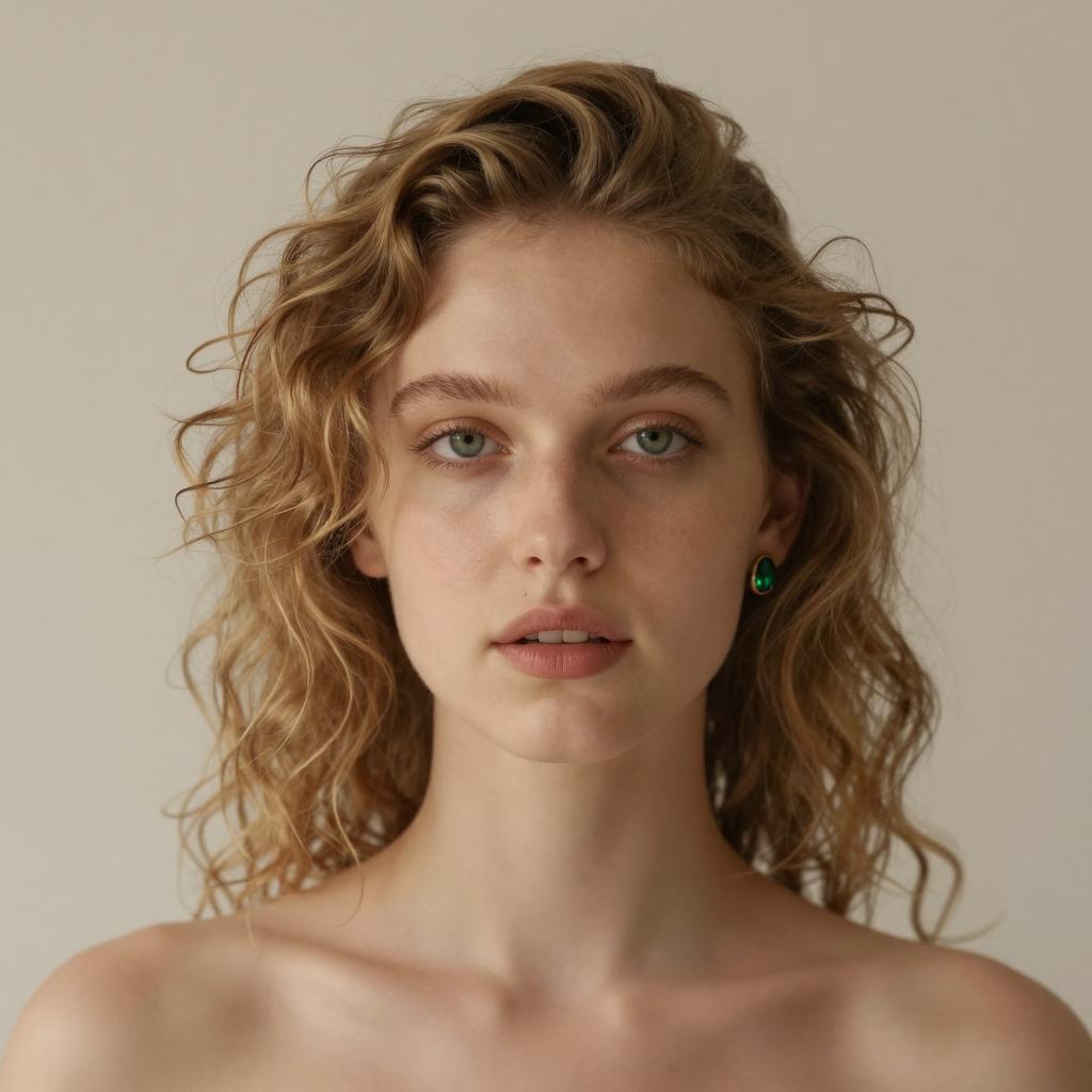 A young woman with light skin and curly blonde hair. She has green eyes, light makeup, and wears a single green earring with a dark gem. Her lips are slightly parted. She is topless, with bare shoulders visible. The background is a plain, beige wall. She gazes directly at the camera with a neutral expression.