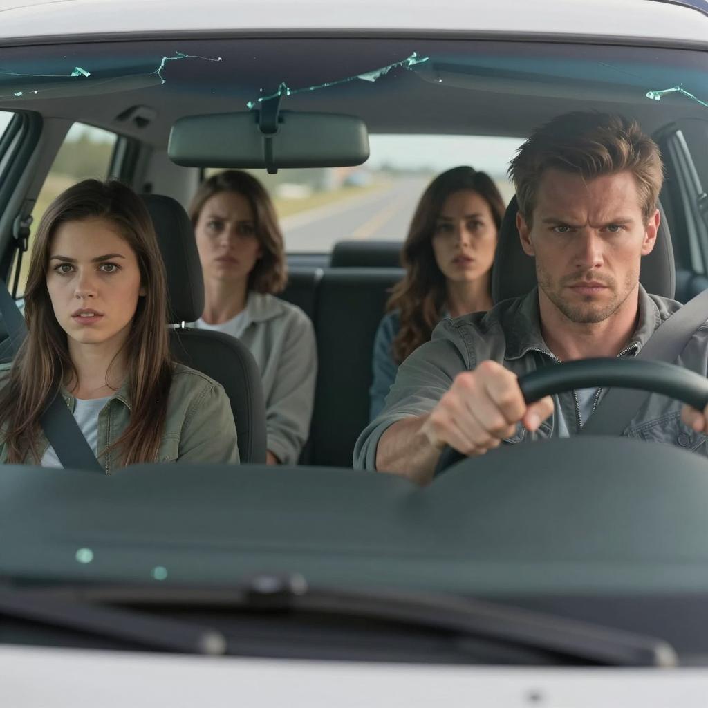 Intense Car Journey Through Broken Windshield