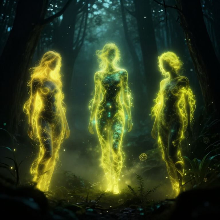 Digital artwork depicting three ethereal, glowing yellow humanoid figures with translucent, neon-like outlines in a dark, mystical forest. The figures have flowing, luminous hair and glowing green eyes, with their bodies emitting bright yellow and green light. The forest background is dense with tall trees and subtle light filtering through the canopy, creating a mysterious, otherworldly atmosphere. The figures stand in a triangular formation, each slightly illuminated by the surrounding light, with ferns and small plants visible at the forest floor. The scene evokes a sense of magical, luminescent energy.