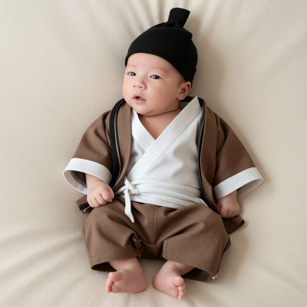 Photograph of a realistic baby doll dressed in a traditional brown martial arts uniform with white trim and a black topknot hat. The doll has light skin, a slightly open mouth, and small, dark eyes. The doll is seated on a white, slightly textured fabric background, with bare feet visible. The uniform includes a white belt tied at the waist. The doll's hands rest on its lap, with fingers slightly curled. The lighting is bright and even, emphasizing the doll's details and the fabric's texture.