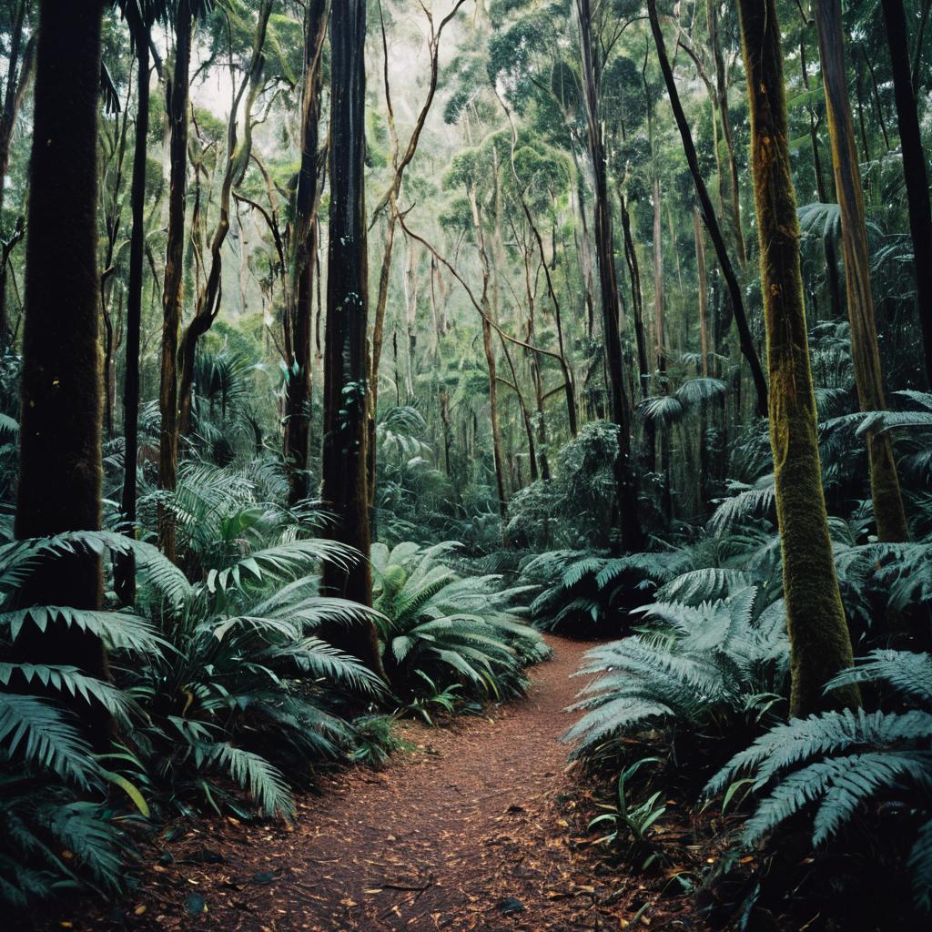 A vibrant Australian rainforest with a narrow dirt path winding through tall trees and dense foliage. The image features a smooth blend of summer and winter colors with soft, natural Rembrandt lighting highlighting the textures of ferns and tree trunks. The photo is taken with a wide-angle lens offering deep depth of field and fine detail, showcasing the rich greenery and humid environment typical of a rainforest.