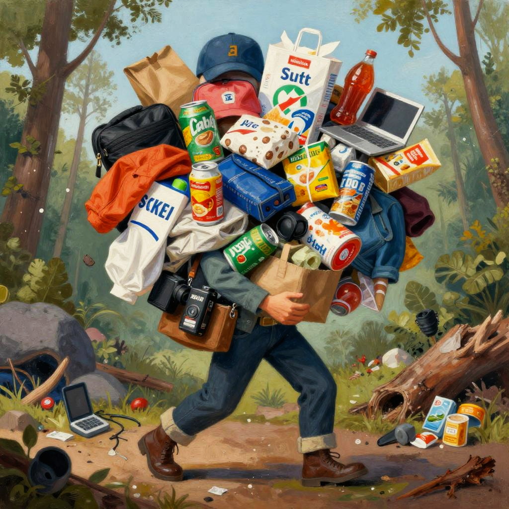 This vibrant digital illustration depicts a cartoonish, heavily-laden hiker walking through a lush, sunlit forest. The hiker, wearing a blue cap, denim shirt, jeans, and brown boots, carries an oversized backpack bursting with an array of colorful items including soda cans, a laptop, snacks, a camera, a water bottle, and an orange bag. The forest background features tall trees, green foliage, and scattered debris, including a broken laptop and snack packets on the ground. The hiker's exaggeratedly full backpack contrasts with the natural setting, emphasizing the weight and volume of the items carried.