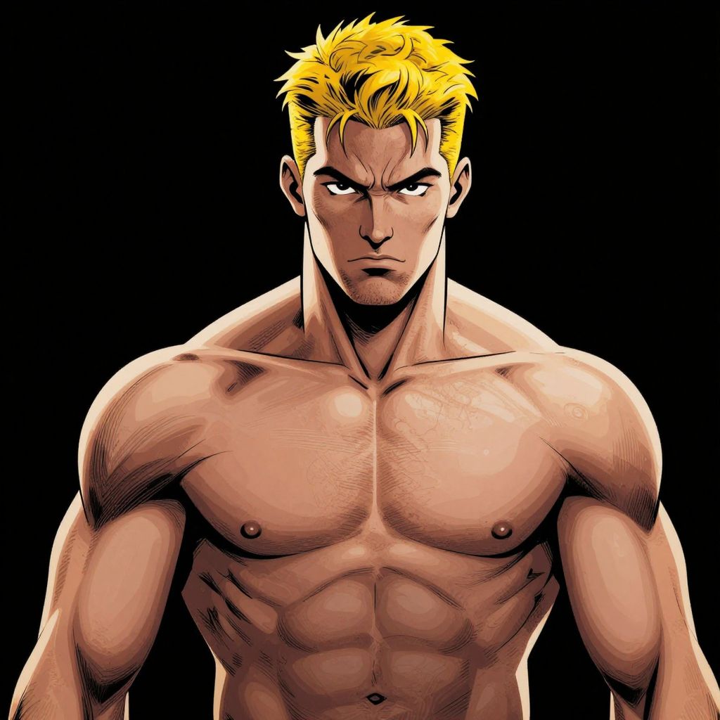 A muscular man with yellow hair and a serious expression, depicted in a stylized, comic book-like art style.