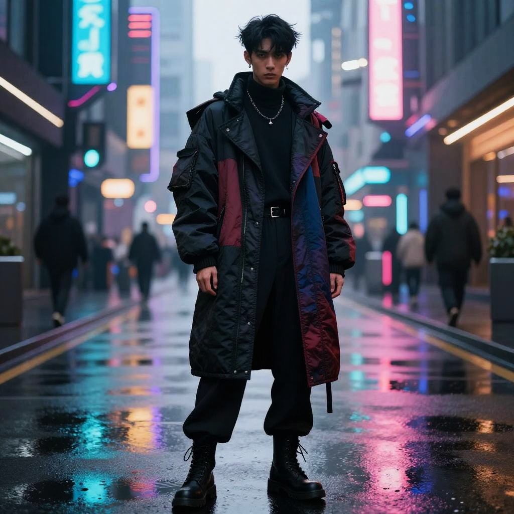 Male model black hair in an avant-garde outfit on a futuristic neon-lit street, glowing reflections on wet pavement, edgy hairstyle with modern cut, bold fashion statement, high detail on fabric textures and urban cyberpunk environment