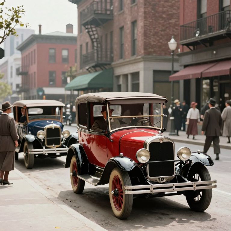 AI colorized photograph of a vintage city street scene from the 1920s, vibrant colors enhancing the details of old cars and people in period clothing, soft sunlight casting long shadows, ultra-realistic style