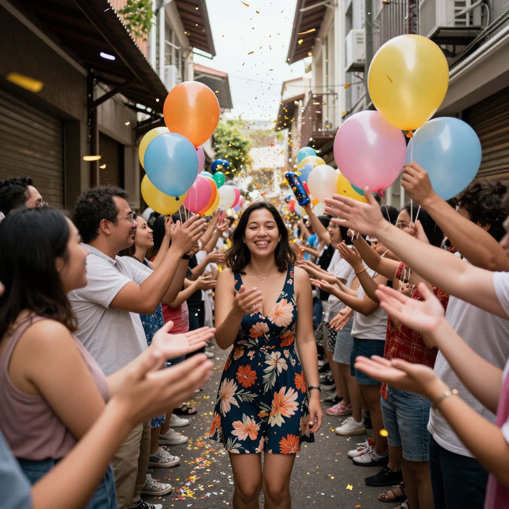 Confetti cascades brightly above a festive crowd gathered in a narrow street, as a smiling woman in a floral dress stands at its center, surrounded by outstretched hands and colorful balloons floating nearby.