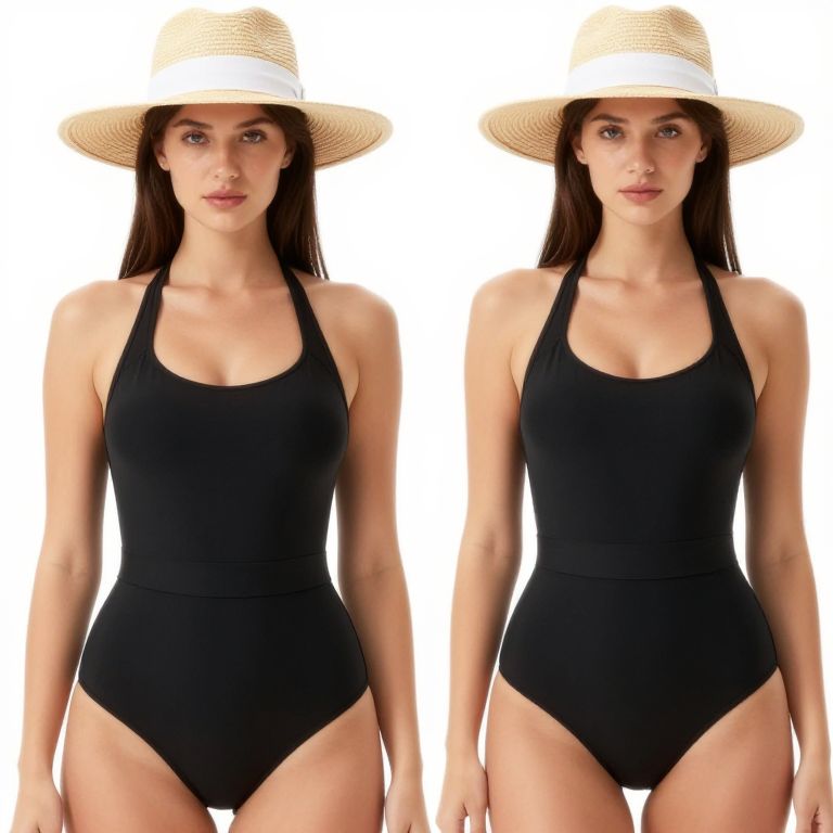 Photograph of a fair-skinned woman with straight, dark brown hair, wearing a large, white, straw sunhat and a black, high-cut one-piece swimsuit. She stands against a plain white background, with her arms relaxed by her sides. Her expression is neutral, and she has light makeup. The swimsuit fits snugly, highlighting her slim, athletic build. Her hat has a slightly textured surface, and she has small, silver stud earrings. The image is symmetrically composed, showing the same frontal view twice.