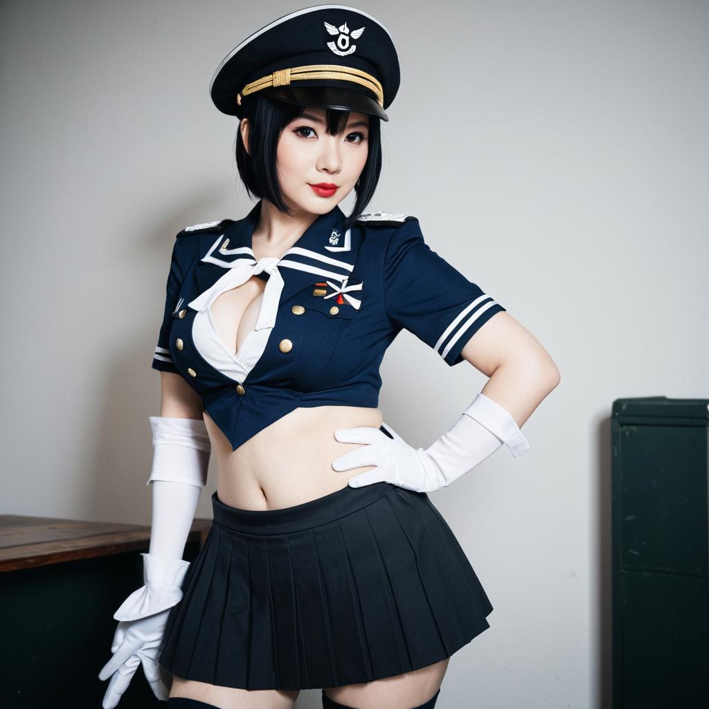 Photo-realistic cosplay photo of person in akitsu maru kai (kancolle) costume. 1girl, pale skin, black eyes, short hair, black hair, large breasts, military uniform, peaked cap, military uniform, white gloves, pleated skirt, black thighhighs