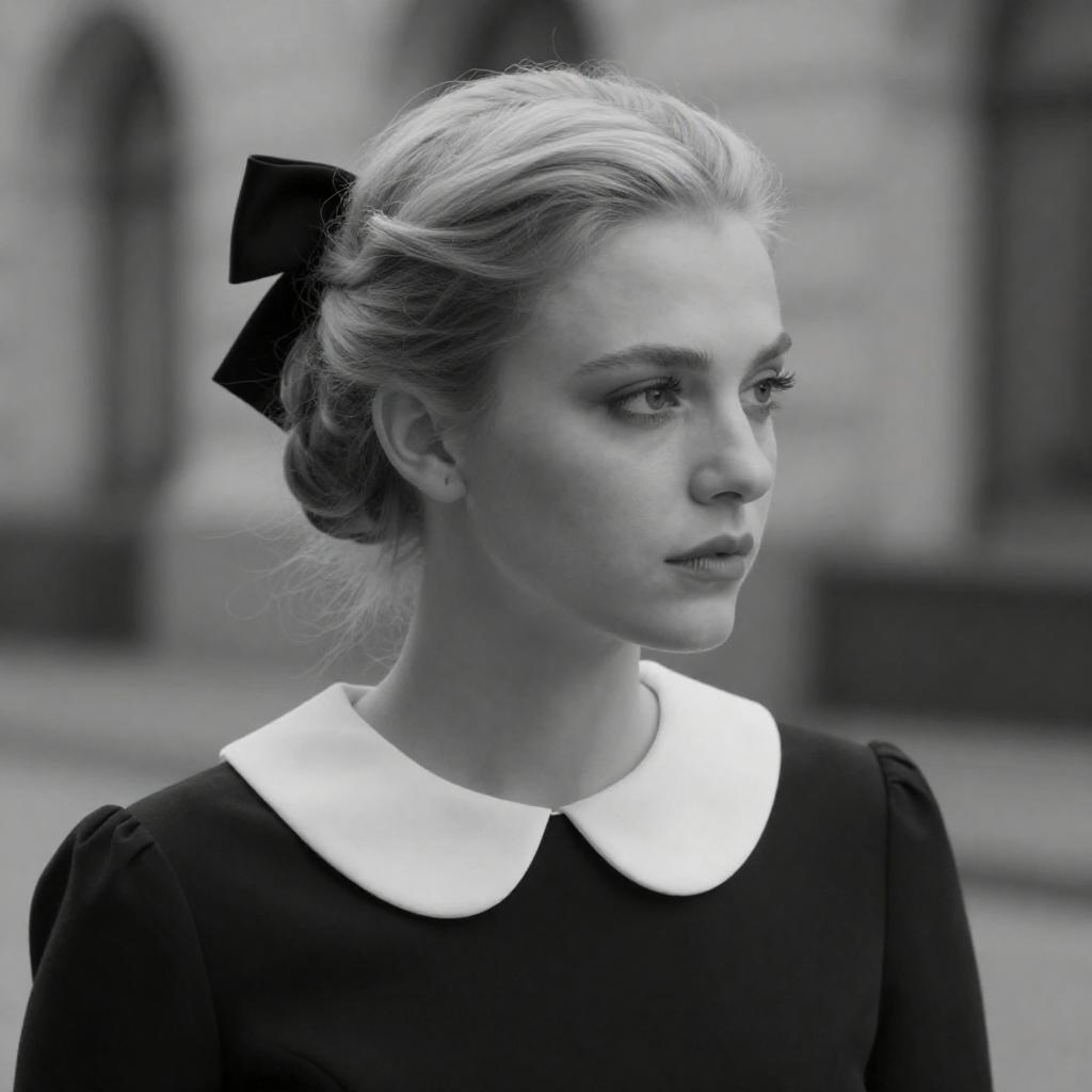 Black-and-white photograph of a woman with light-colored hair in an elegant updo, wearing a black dress with a white collar and a black bow in her hair. She has intense, slightly serious facial expression, looking to the right. Background is blurred. She is the only person. Textures include smooth hair, soft fabric, and subtle lighting.