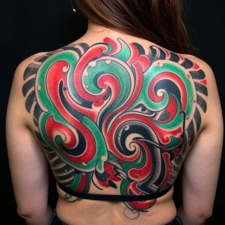Photograph of a person with long brown hair, viewed from behind, showcasing a large, intricate back tattoo featuring vibrant, swirling designs of red, green, and black. The tattoo covers most of their upper back and shoulders, with the person wearing a black strap that crosses over their chest. The background is blurred and dark, highlighting the colorful tattoo.