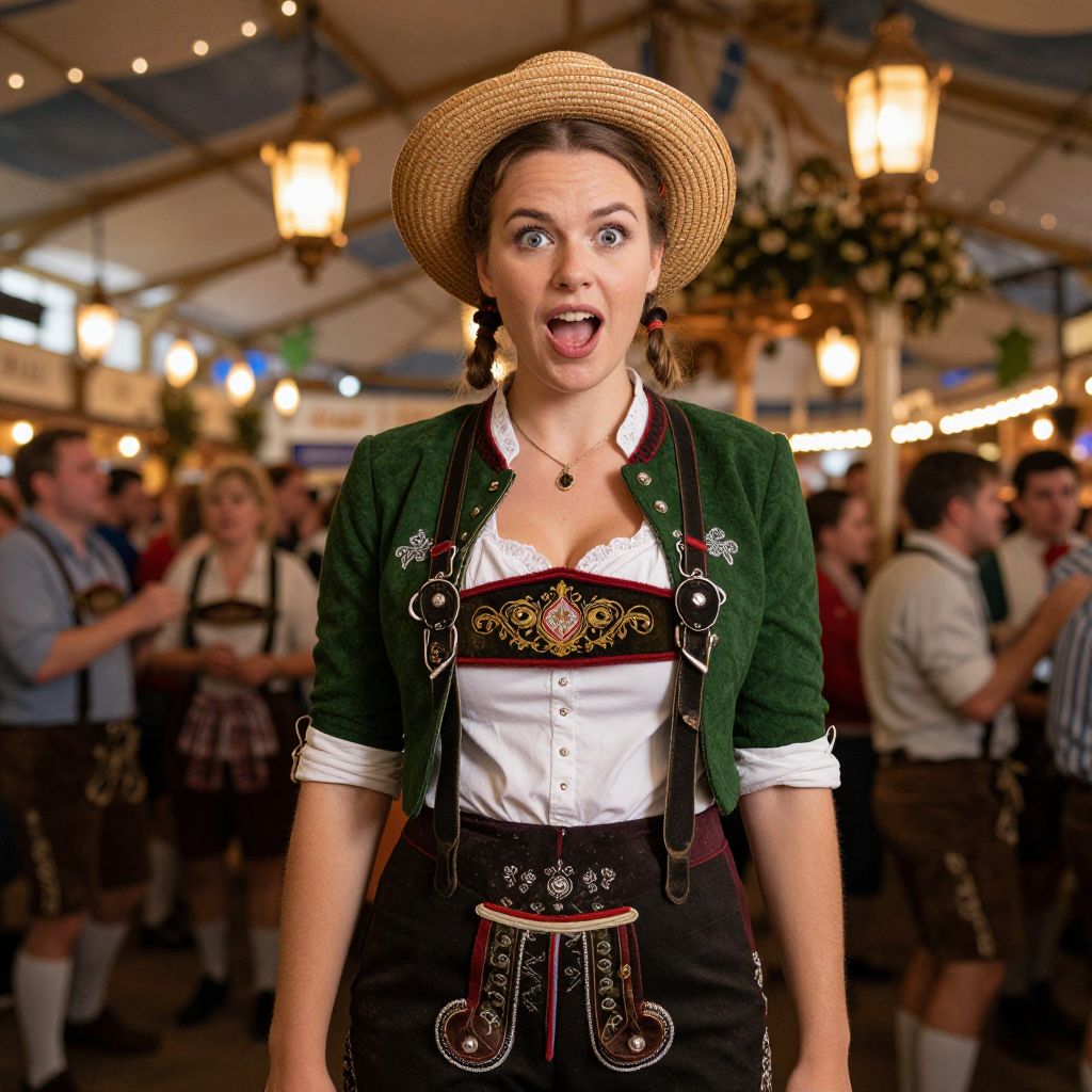 Photograph of a surprised woman in traditional Bavarian attire, including a straw hat, green cardigan, white blouse, and black dirndl with silver