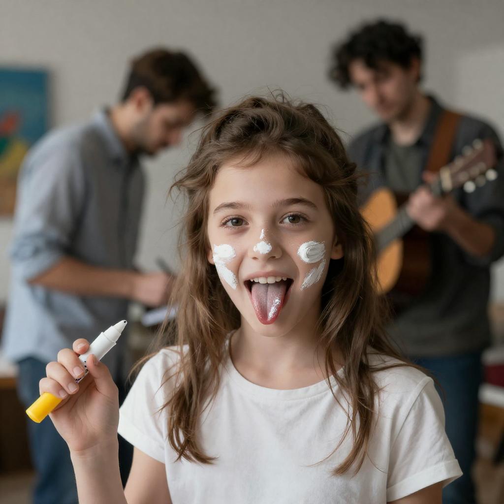 A cheerful young Caucasian girl with messy brown hair, face and tongue smeared with white paint, holding a yellow marker in her hand and sticking out her tongue. In the background, two blurred men are present: one wearing a light blue shirt bent forward and the other playing an acoustic guitar. The scene takes place indoors in a dimly lit room with a brick wall and a colorful painting on the wall.