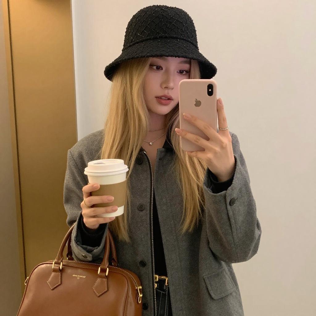 Photograph of a young woman with long blonde hair, wearing a black patterned hat, grey jacket, and holding a coffee cup in her right hand. She carries a brown leather handbag in her left hand and takes a mirror selfie with a pink phone. The background features a golden-framed mirror and warm, yellow lights.