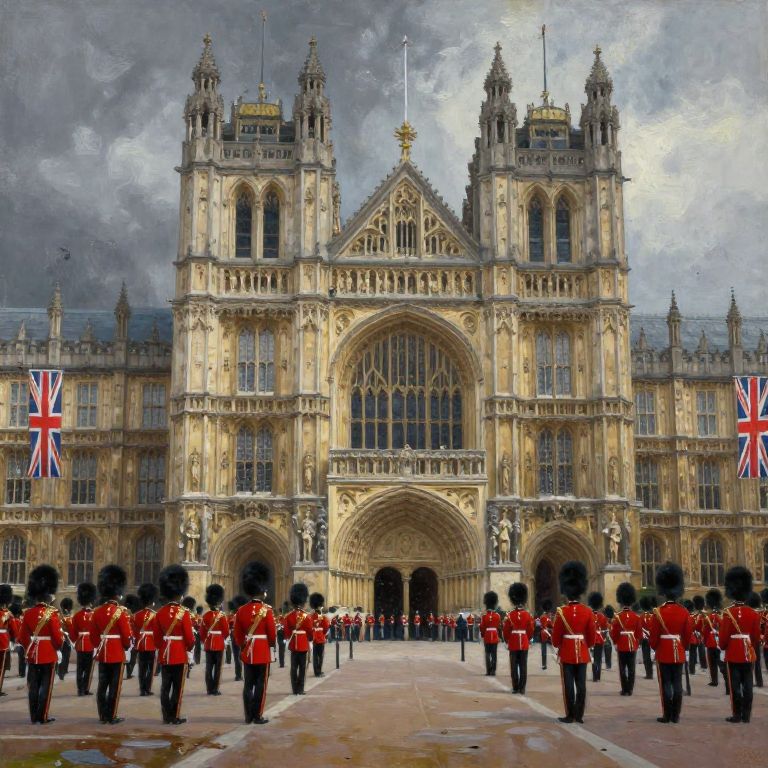 Oil painting depicting British red coat guards in red and gold uniforms standing in formation in front of a grand, monumental Gothic building adorned with British flags. The scene features moody, dark tones and emphasizes the architecture's intricate details and the solemnity of the guards.
