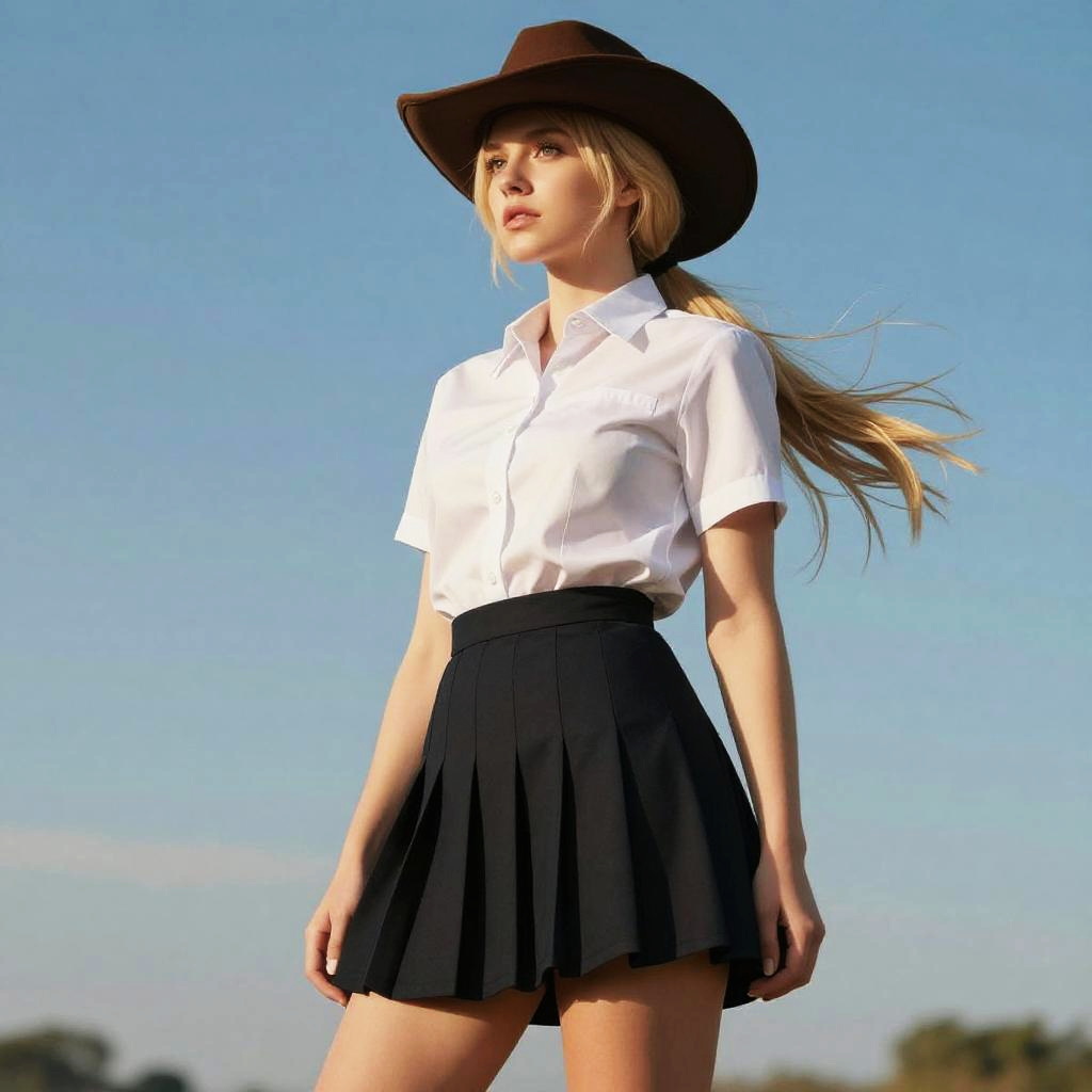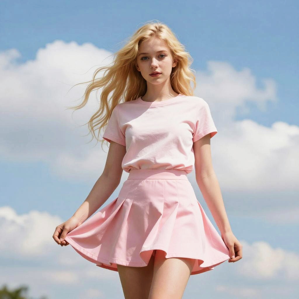 Blonde young girl dressed in pink shirt lift and miniskirt, cloudy sky bright sunny day, wind upskirt(masterpiece:1.2) (photorealistic:1.2) (best quality) (detailed skin:1.3) (intricate details) (8k) (detailed eyes) (sharp focus)