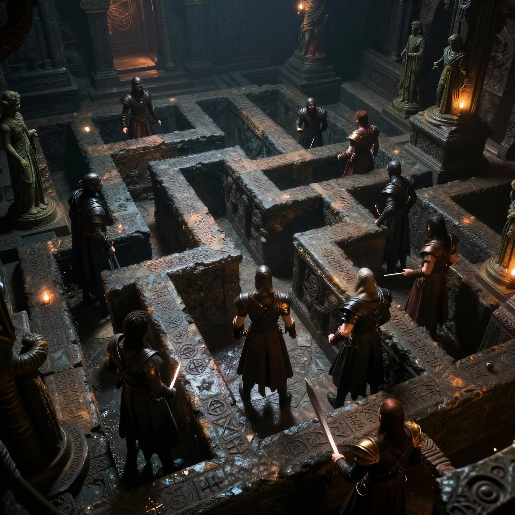 Dungeons and dragons image of a heroic party exploring a labyrinthine dungeon filled with ancient traps, eerie statues, and cryptic runes, cinematic perspective with dynamic lighting and vivid fantasy details.