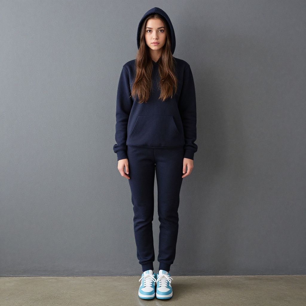 "comfy rave costume, solo, hood, red footwear, looking at viewer, hands in pockets, shoes, long hair, full body, belt, sneakers, standing, hood up, brown hair, 1girl, indoors, male focus Realistic photo of casual sexy person with pretty face"