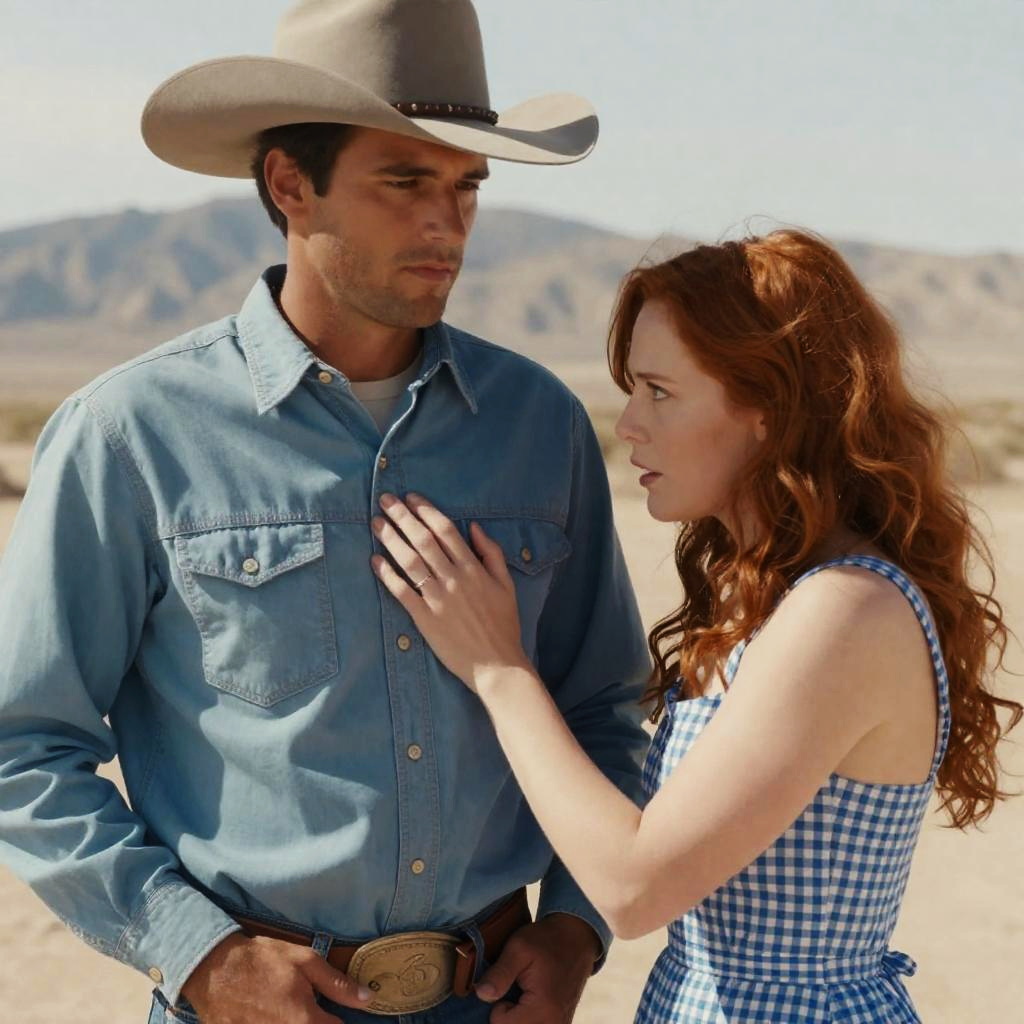 Man with a tan cowboy hat, white V-neck shirt, and outstretched arm leans on a wooden fence. Background: woman with brown hair in blue shirt, standing near a white door on a red brick house. Sunlight casts shadows. Man smiles, woman looks away. Man holds a black remote in his right hand.
